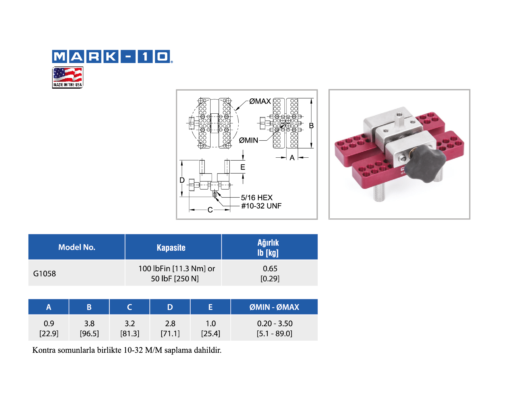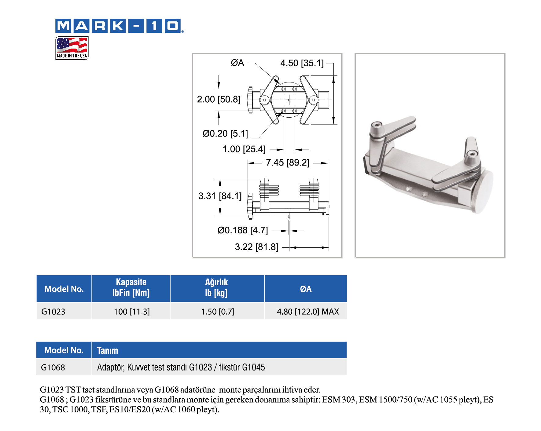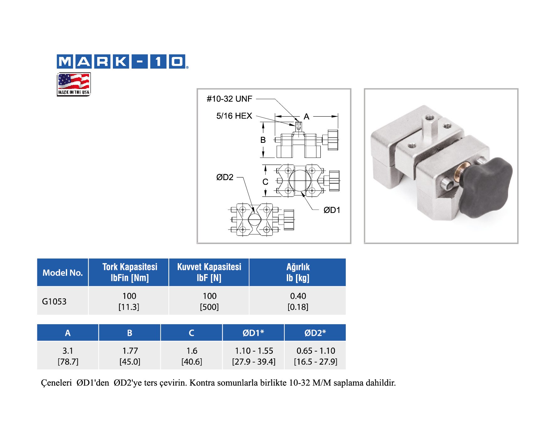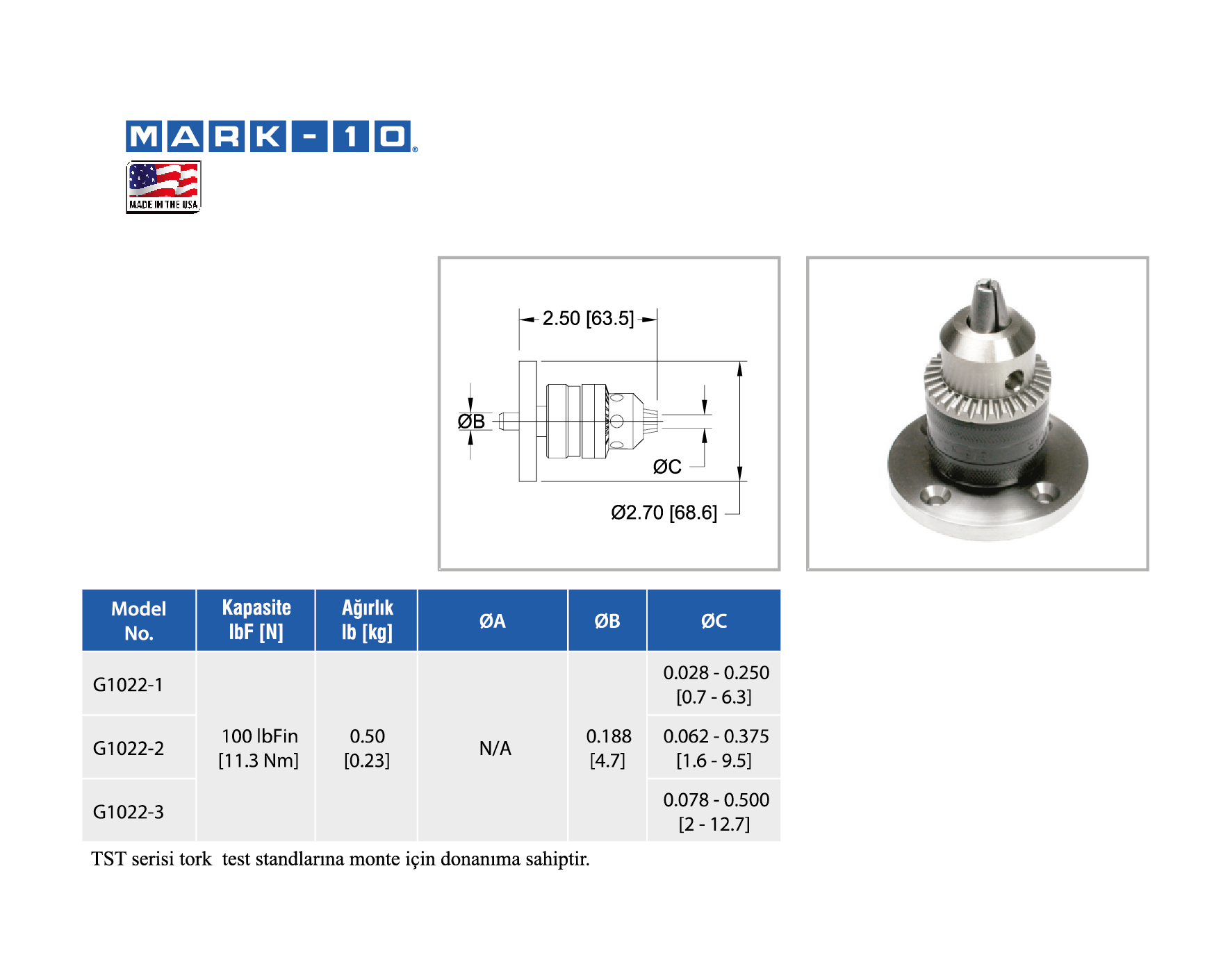 Farklı boyutlardaki parçalar test edilebilir ve manuel olarak bir tork ölçüm cihazı ile kullanılabilir veya test standına bağlanabilir.