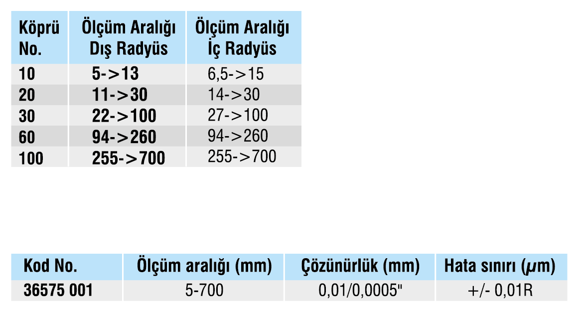 * Farklı dairesel radüsler için değişik uzunluktaki köprüler ve hassas ölçüm elde edilir