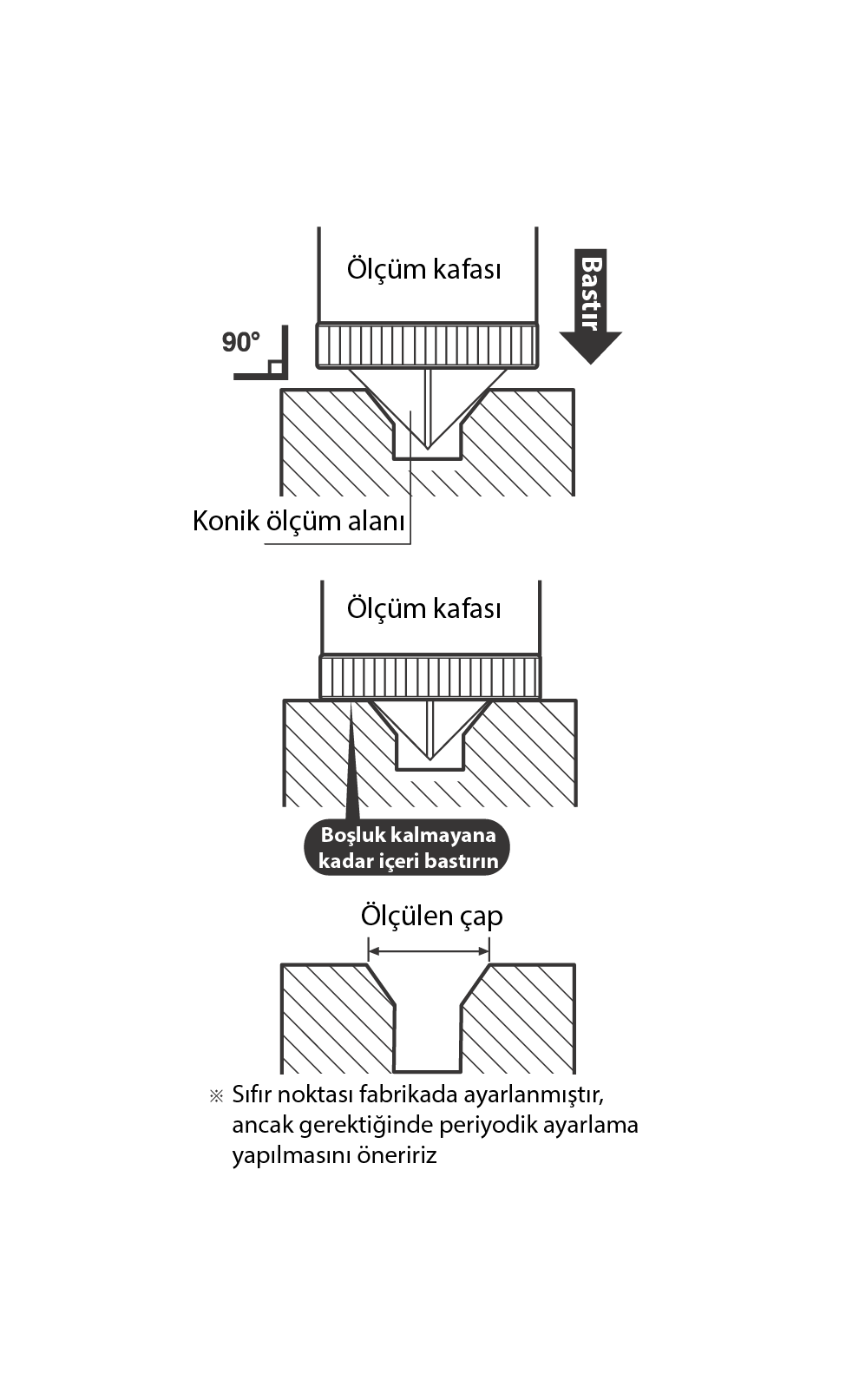 Bu cihaz doğrudan okuma yapan bir mastardır; herhangi bir ayar mastarı, standart veya arama tablosu gerektirmez.
