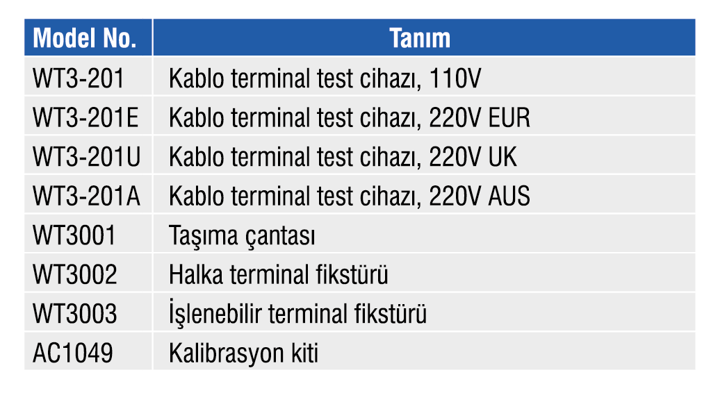 WT3-201 manuel kablo testinin gereklerine uygun entegre bir çözümdür. Ergonomik bir kol kuvvetin kolay uygulanmasını sağlar. Ayarlanabilir terminal fikstürü AWG 3 çapa kadar (0.25 in (6.3 mm)) çoklu kanallara sahiptir. USB çıkış, veri hafızası ve zirve kuvveti gösterme özelliği ile birlikte temin edilir.