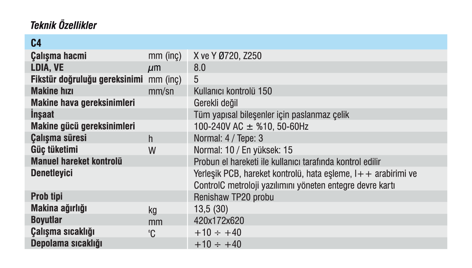C4, motorlu 4 eksene (X, C, Z, P) sahiptir, 3 boyutlu olarak yüksek performanslı ölçümlere izin veriri. Dikey ve yatay bir prob ucu ile donatılmış özel problama modülü, özellikle ölçülen büyüklüğün yeniden konumlandırılmasını azaltarak, ölçüm olanaklarını önemli ölçüde artıtır.